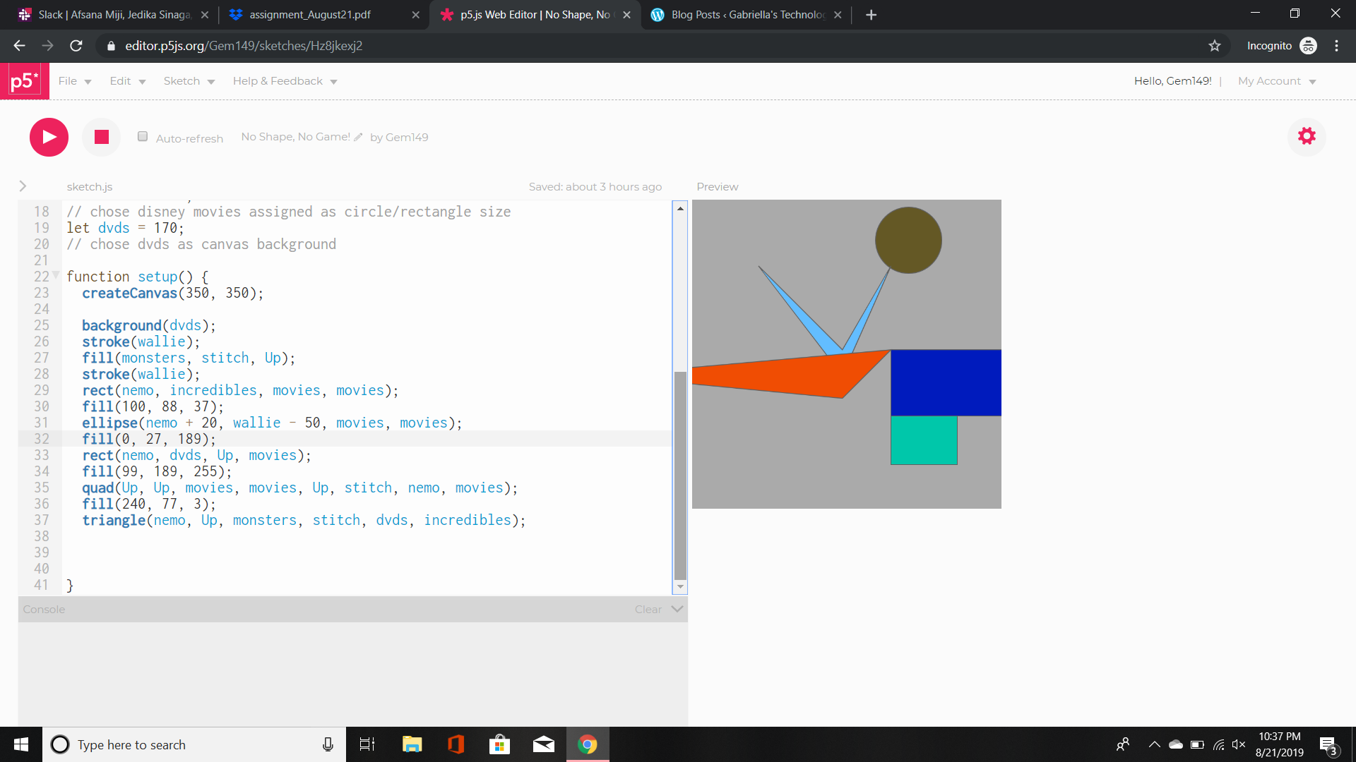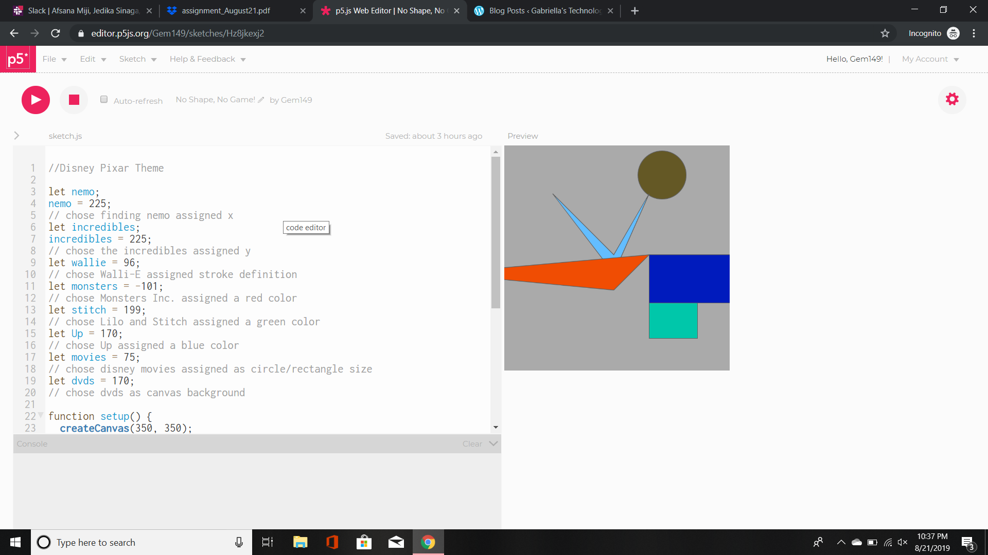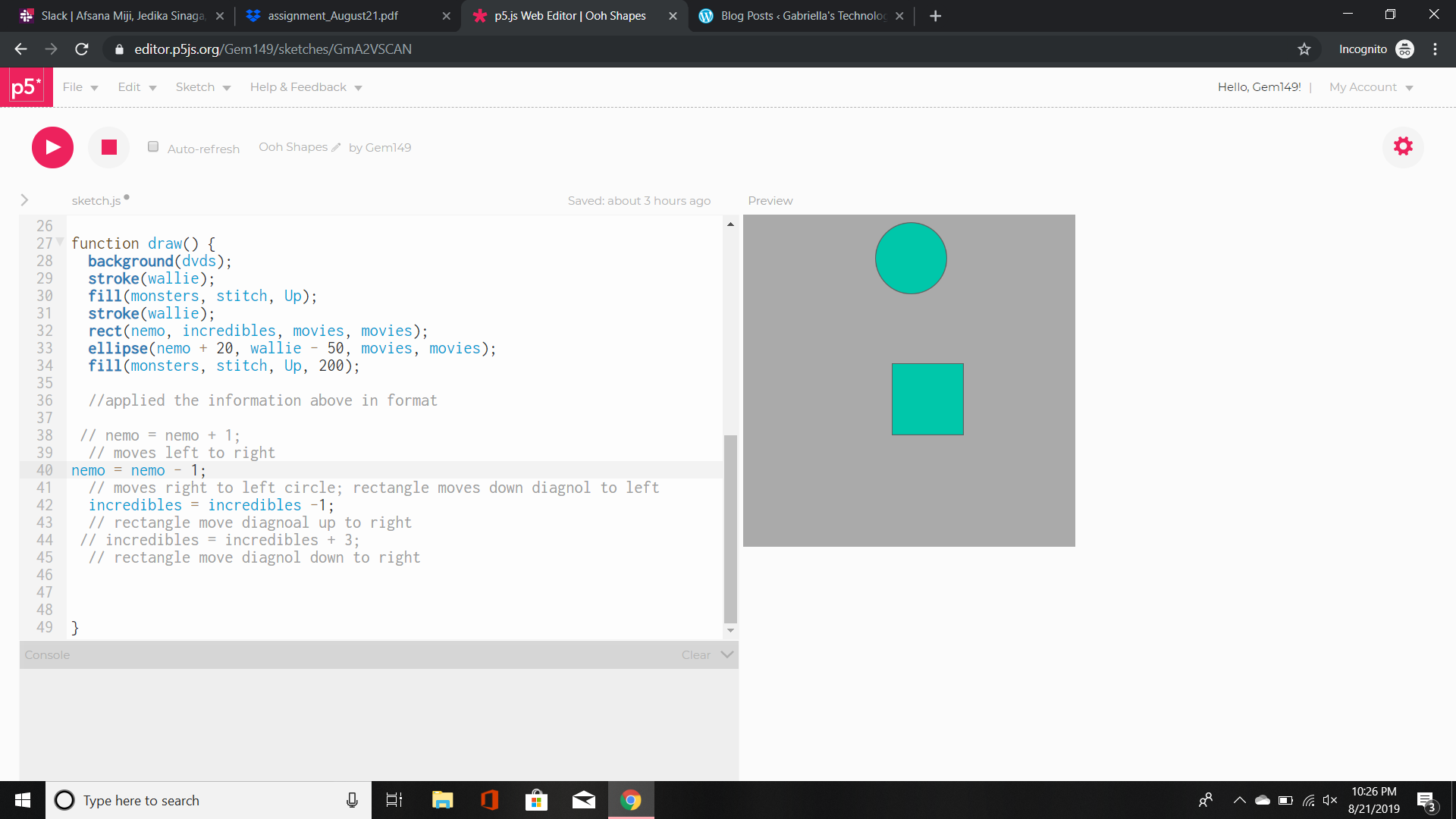 The image above shows my disney/pixar inspired variables. I picked random numbers that I liked and applied them to the variables in the global variable. Once the code was ran, my commands were executed. The result was that the circle moved to the right and the rectangle moved diagonally to the right hand corner of the canvas. In this canvas the image is constantly moving and changing due to the loop within the draw command.