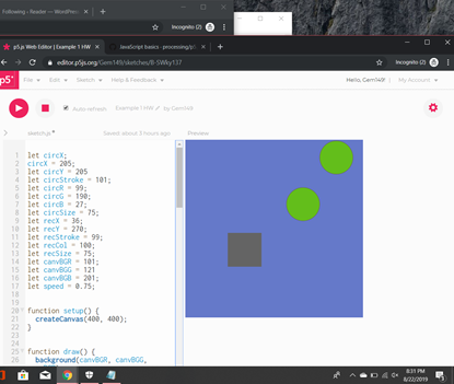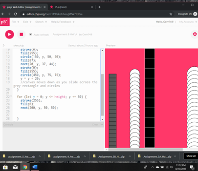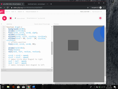 For the second part of the homework, I created an object that created both a rectangle and a circle before making them move across the screen. I also proceeded to add my sketch to the HTML which in turn could access my code from a different file.