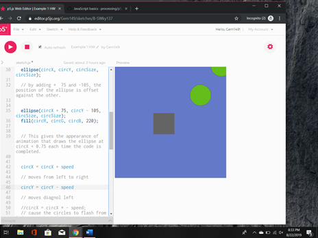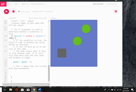 In example one, we learned about the if command. We learned that we must assign our global variables in order for our code to work. For learning purposes we declared the global variable at the top of our code. After we did that, we proceeded to creating our shapes, assigning color, and outline. We then assigned the speed of our shapes to the x and y axis. This will allow the shapes to move across the canvas. The last thing we did was assign the shapes to the if command. The if command in code tells the computer if this is done produce this. In our case we told the computer that if circX is greater than or equal to the width of the canvas or if circX less than or equal to one hundred take the variable speed and subtract it by one. This in turn would cause the image to move backwards as it reaches the edge of the canvas.