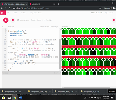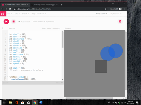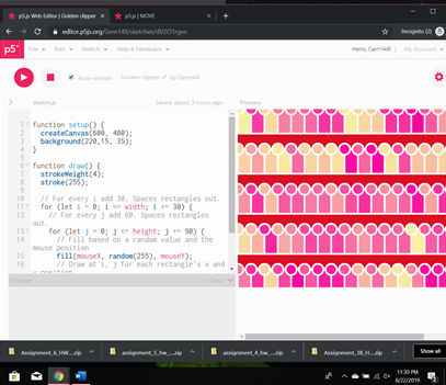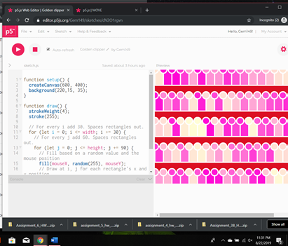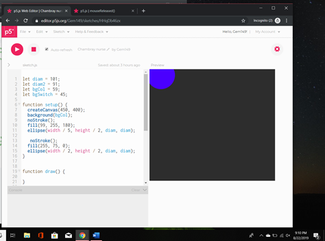 WoW! It’s been a crazy day, I learned so much my brain feels like it’s going to explode. In class we learned about the if command. We learned how we need to assign variables in the global variable first before making an argument. Depending on the outcome of the argument (true or false) the code will change and so will our image. I enjoyed working in groups as we are still new to this and every set of eyes counts. The intimate feel allowed me to ask my peers what they would do with the code or what they would change. I also liked working as a class because we all have different struggles with coding but we want to understand how things work to improve. In the homework, we got to see different variations of arguments, how a mouse pad works, etc. Attached below are the first five examples of code. I liked to be creative as I dabbled in adding extra code here and there.