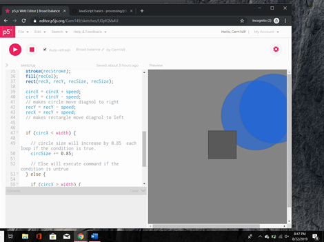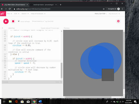 In example two, we learned about the if and else command. We learned that we must assign our global variables in order for our code to work. For learning purposes we declared the global variable at the top of our code. After we did that, we proceeded to creating our shapes, assigning color, and outline. We then assigned the speed to our shapes to the x and y axis. This will allow the shapes to move across the canvas. The last thing we did was assign the shapes to the if and else command. The if command in code tells the computer if this is done produce this. In our case we told the computer that if circX is less than or equal to the width of the canvas to change the circle Size to increase by 0.85. Now let’s talk about the else command. The else command is the opposite of if, for example the if command is supposed to do be true than command is executed. But if the command is false the else command will tell the code to do something else. In human terms, if the park is open we can go play. If the park is closed let’s get ice cream. When if is false the code associated with the command is ignored and the computer executes the commands listed under the else command. Now getting back to the example else if circX is greater than the width the speed will change to multiple by negative one. Essentially this would reverse direction if the statement was false. Then change the circle size to multiply by negative one.