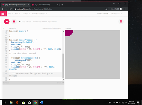 In example three we learned about the mousePressed and mouseReleased command We learned that we must assign our global variables in order for our code to work. For learning purposes we declared the global variable at the top of our code. After we did that, we proceeded to creating our shapes, assigning color, background and outline. We then set the shapes location by dividing the width and height by a number. This number will determine the shapes position by looking at the numbers from the createCanvas. It will then plot the circle on those coordinates before drawing the circle. After that we used the function mousePressed. When you click on the mouse the shape should change color and location. In this case the green circle should move to the corner and turn blue. The second circle I created which is orange has a function even if it doesn’t appear that way at first. Which leads me to the mouseReleased function. The mouseReleased function means that if I release my mouse something else should happen. In this case if I let go off the mouse my circle should turn purple and the background should change colors before taking it’s new position. Essentially, the mouseReleased changes the image as it is called upon when the command is called.