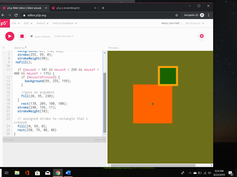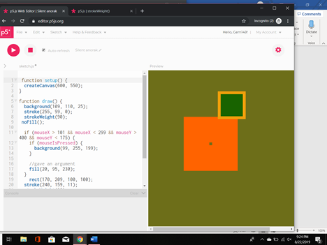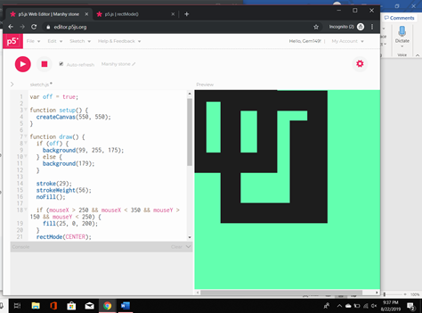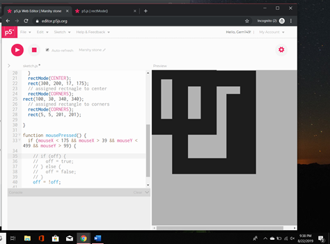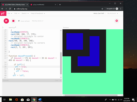 In example 3B we learned about using a variable to affect the outcome. We first assign variable off to true. What we are saying is that variable off is equal to the Boolean for true. Let’s move to the it and else command now. We are saying if the variable off is true let the background change to this color. If the variable off is false let the background change to this color. The next step is to create the next if statement. Before I move on just a quick recap about what mouseX and mouseY are. The mouseY command holds the current vertical position of the mouse relative to the canvas. If touch was used instead of mouse input, mouse X and Y would hold the most recent touch point of x and y. Now for the if statement, if mouseX if greater than two fifty and mouseX is less than three fifty and mouseY is greater than one fifty and mouseY is less than two fifty fill the background with these colors. The next thing we are doing is setting the location of the rectangle. So rectMode is the command to set the location of the rectangle. In reference to p5 rectMode(CENTER) places the rectangle in the center of the canvas whereas rectMode(CORNERS)sets the rectangle in the (CORNERS).Now we create our rectangles and place them under rectMode. Now we will utilize the function mousePressed followed by the if command. Quick recap mousePressed is called once after every time a mouse button is pressed over the element. Now to the if in our mousePressed, if mouseX is less than one seventy five and mouseX is greater than thirty nine and mouseY is less than four ninety nine and mouseY is greater than ninenty nine that off is true or else it is false. Outside the function we put off is equal to not true which makes it false hence displaying a different image.