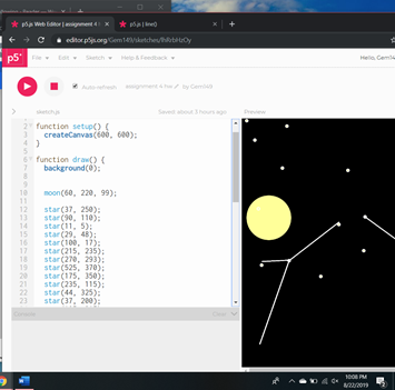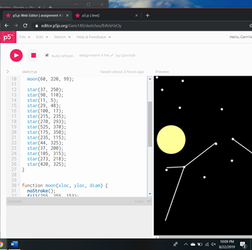 In this condensed code we will be using we create the function star. Within the function we also put the arguments we are going to be using. In this case we are using xloc, and yloc that we will eventually use to create our star. We then created our stroke which is our color of said star before creating a point using the xloc and yloc. Now that we created both functions we are going to go back to function draw. In here we will put moon function along with the xloc, yloc, and diameter. We should than see our moon on the canvas. We will then add our star command as many times as we want to create stars. Just remember not to forget your arguments which consists of xloc and yloc. For fun I added inside the function star lines to make constellations. These lines as per p5 reference must include four points hence the reason there are four numbers in each line.