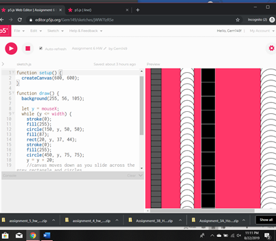In example 6 we learned about the for loop. For condensing purposes I will only go over one of the shapes I created. The first thing to do is within draw select you background. Once that’s created we can start working on our shape. In this case we are going to make a variable y and set it to the command mouseX. Quick recap about the mouseX command – the mouseX command holds the current horizontal position of the mouse relative to the canvas. So before we go forward lets talk about the while loop. The while loop employs a Boolean test that must evaluate to true in order for the instructions in the curly brackets to be exhausted. Back to the while command, we are saying that if y is less than or equal to width do the following fill the shape, change the outline color, and create the circle. You are then going to type y = y + 20 or any number. This will make the shape move down the y axis so much. So before we go forward lets talk about the for loop. The for loop is used to check for certain conditions and then repeatedly execute a block of code as long as the conditions are met. In this case we are saying the variable y minus zero. If y is less than or equal to the height than add fifty to y. If this condition is correct than add this outline, fill, and create shape. If not then these commands will be overridden and dismissed. This will than appear in the continuous loop.